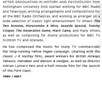 After graduating in History and Psychology from Nottingham University Dick started working for BBC Radio and Television, writing arrangements and compositions for all the BBC Radio Orchestras, and working as arranger on a wide selection of classic light entertainment TV shows: The Two Ronnies, Morecombe & Wise, Seaside Special, Tommy Cooper, The Generation Game, Marti Caine, and many others, as well as composing for drama productions for BBC TV, Scottish TV and Granada.