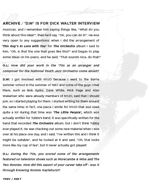 This CD served as my introduction to the talents of saxist-arranger-composer Dick Walter, and a very impressive introduction it proved to be. Each track is a Walter original, and they span a two-decade period, during which modern big band jazz has been at a premium, to say the least. As a jazz composer Dick Walter can stand alongside such worthies as Gerry Mulligan, Bill Russo, Francy Boland, Bob Florence and Bill Holman.